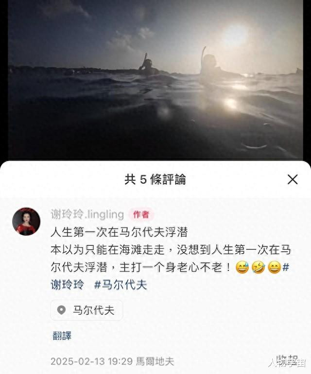 香港“永远的新抱”谢玲玲近日分享自己在马尔代夫浮潜的视频短片,表示人生第一次在马尔代夫浮潜,“主打一个身老心不老”。身后有五名儿女和前婆婆撑腰的谢玲玲,晚年真是活出了境界。